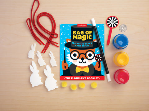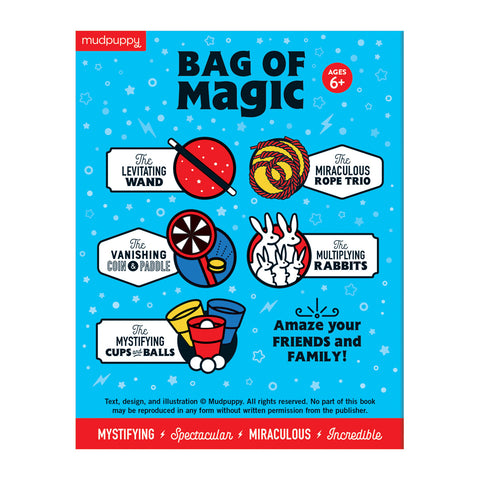 Mudpuppy’s Bag of Magic is perfect for beginner magicians ages 6+ to learn simple magic tricks. Amaze friends and family with over 15 tricks, including mystifying cups and balls, multiplying rabbits, and the levitating wand! Packaged in a silkscreened fabric bag with drawstring for easy storage and transport.